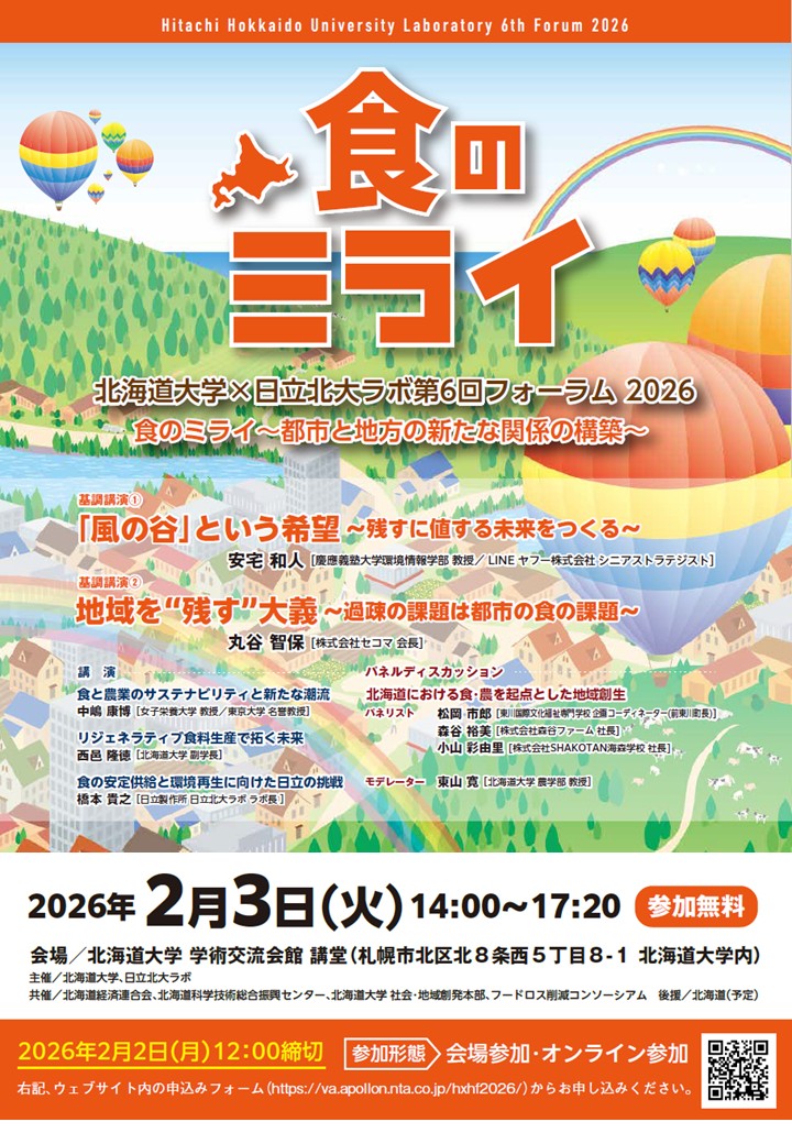 このたび、「北海道大学×日立北大ラボ 第6回フォーラム『食のミライ ~都市と地方の新たな関係の構築~』」において、弊社がパネリストとして参加させていただくこととなりました。